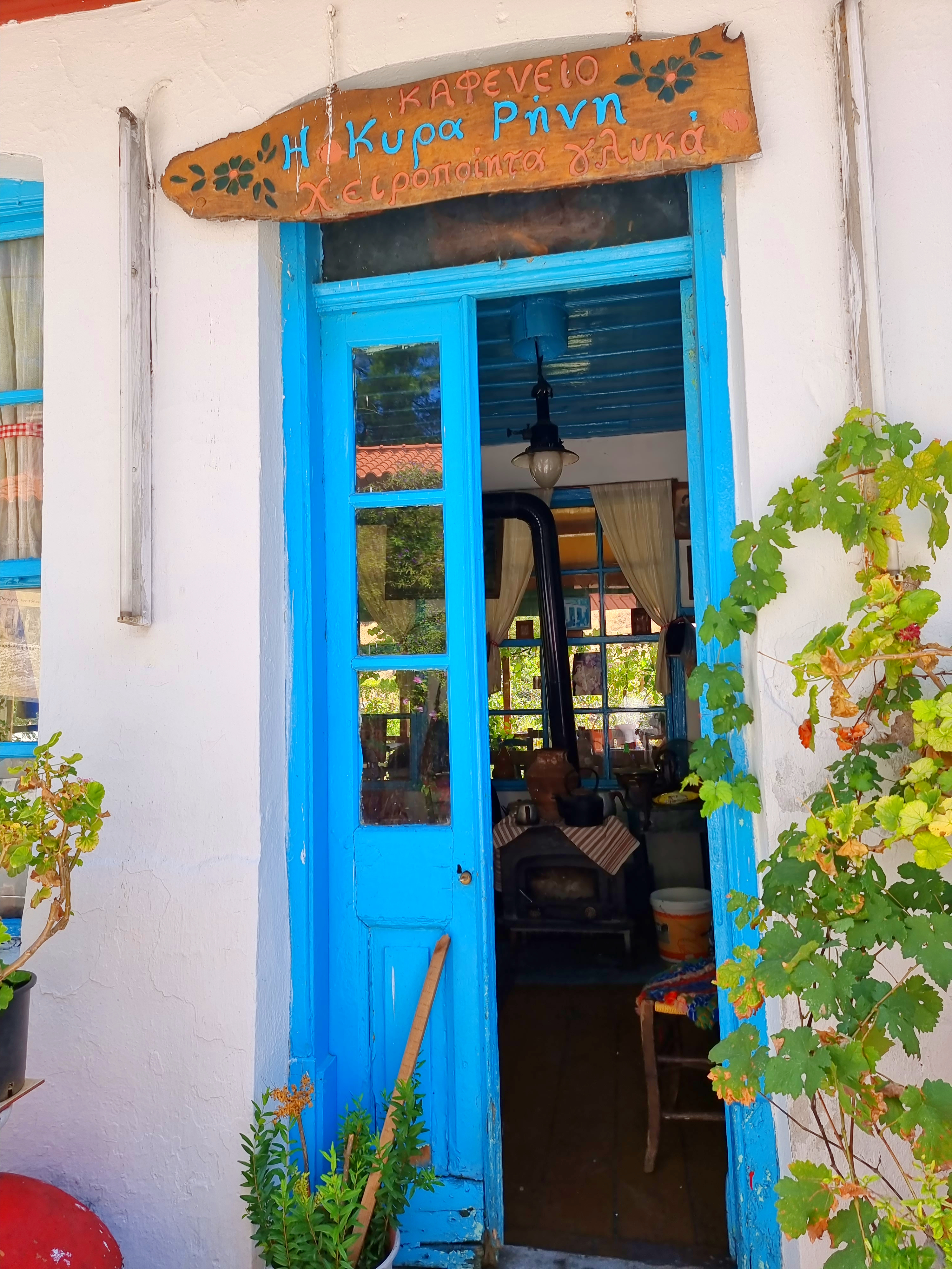 ☛ Παίρνουμε τον δρόμο από τη χώρα της Μυτιλήνης για το Πολιχνίτος , στη μέση περίπου της διαδρομής και στο ύψος της διασταύρωσης προς Αγιάσο κατευθυνόμαστε προς τον Άγιο Δημήτριο , εκεί θα βρούμε το αιωνόβιο καφενεδάκι της κυρά Ρήνης (κατά κόσμον Ειρήνη Καρέτου) η οποία υπήρξε μια μαστόρισσα καφετζού αλλά και χρυσοχέρα στη παρασκευή γλυκών του κουταλιού. Γεννήθηκε στην Αγιάσο το 1921 και πέρασε όλη τη ζωή της μαζί με τα έξη εγγόνια και τα έξη δισέγγονα της σε αυτό το καφενεδάκι φτιάχνοντας γλυκά του κουταλιού με τον πιο αγνό και παραδοσιακό τρόπο. Πέθανε τον Οκτώβριο του 2018 σε ηλικία 97 ετών. Την τέχνη της κυρά Ρήνης συνεχίζει σήμερα η κόρη της η κ. Αφροδίτη Ακαμάτου , την ρωτώ αν ανταποκρίνονται στην αλήθεια αυτά που έχουν γραφτεί σχετικά με την φιλοξενία του λαϊκού ζωγράφου Θεόφιλου Χατζημιχαήλ στο καφενείο τους. Μου απαντάει χωρίς δισταγμό : « Ο παππούς μου προσέφερε στον Θεόφιλο ένα πιάτο φαγητό και ένα κρεβάτι για να ξαποστάσει , κι αυτός για να ανταποδώσει την φιλοξενία ζωγράφιζε επάνω στους τοίχους και τις ξύλινες κασέλες τις χαρακτηριστικές φιγούρες του». Σήμερα τα έργα του Θεόφιλου έχουν ξεθωριάσει από την υγρασία στο πέρασμα των δεκαετιών , δεν έγινε όμως και καμία προσπάθεια για να συντηρηθούν οπότε θα δυσκολευτείτε να τα διακρίνετε. Η κ. Αφροδίτη Ακαμάτου εκτός από τα γλυκά φτιάχνει και νοστιμότατες χάχλες (χάχλις στη ντοπιολαλιά του νησιού ) από σιτάρι και πρόβειο γάλα. Οι χάχλες που έχουν το σχήμα βαρκούλας τρώγονται βρασμένες σαν σούπα-τραχανάς , αλλά και σκέτες με το παραδοσιακό τυρί της περιοχής το τουλουμοτύρι που φτιάχνει στο διπλανό Λισβόρι ο τυροκόμος Παναγιώτης Χαδεμένος .