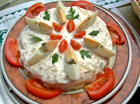 μύδια, αρακά, αυγά, καρότα και βραστό μοσχαρίσιο κρέας ή κοτόπουλο . Αυτή τη σαλάτα θα την βρείτε